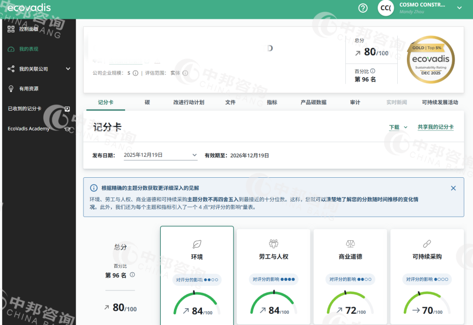 恭贺XX建设工程(上海)有限公司2025年12月EcoVadis取得80分的优秀成绩
