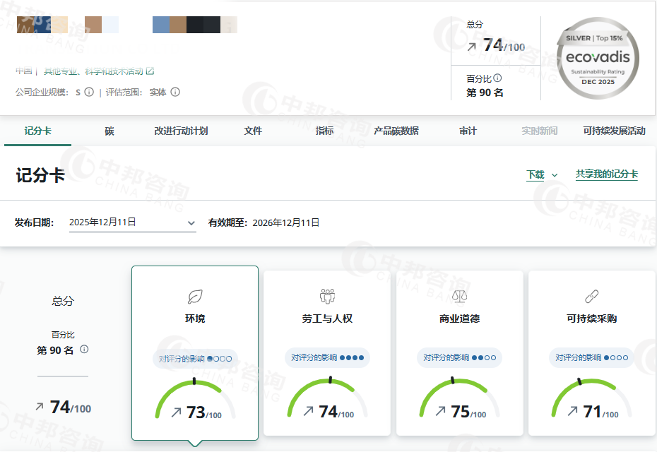 恭贺上海XX翻译有限公司2025年12月EcoVadis取得74分的优秀成绩