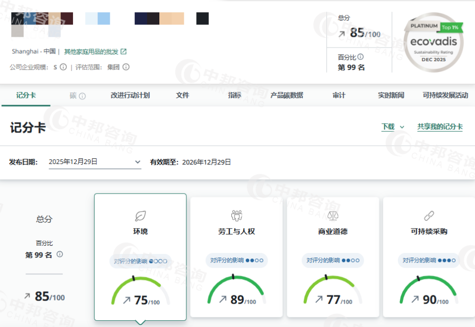 恭贺XX道具(上海)有限公司2025年12月EcoVadis取得85分的优秀成绩