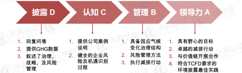 CDP评分分为四个等级,这些等级代表企业环境管理工作提升的过程,包括: